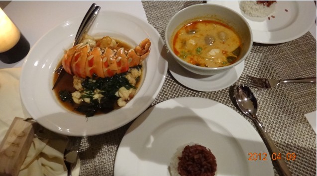 21:00我们来到都喜天阙的泰式餐厅来体验它号称在全世界都比较牛B的皇室级别的泰国菜。餐厅的环境确实没的说,是双层的建筑,楼上是个酒吧,只喝不吃的。至于这里的泰国菜。。。完全没让我失望啊!!!!!!!感动到流泪!!!!!!而且价格也比我想象的要便宜。我们两个人点了一份辣味龙虾、一份咖喱老虎虾(两个人点两个主菜就够吃了,没必要点整套,喝的我们没点,回房间和免费水去!),随餐还赠送了米饭和一种叫萨摩萨的泰式小吃。两种虾各有千秋,好吃!确实是皇室水准!!!(其实我也不知道皇室是个啥水准)就连赠送的那个叫萨摩萨的小吃的味道也好到爆!吃完我还厚着脸皮让服务员又送了我们一盘萨摩萨。。。