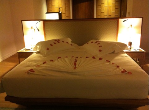 饭后在海边的躺椅坐了坐,回到房间发现已经布置成了蜜月的感觉: