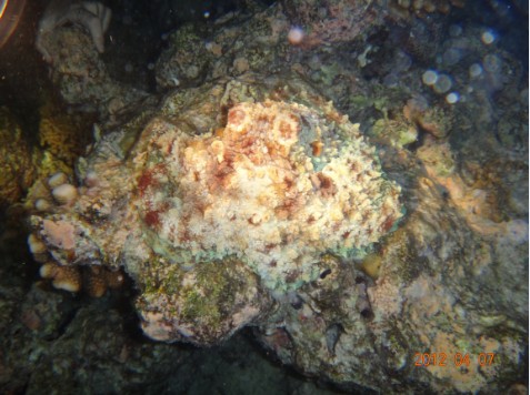 你看的出这是一条伪装的很好的大章鱼不?细心的你一定看到它的一边眼睛了!要不是它在蠕动,我还发现不了这个大家伙呢!