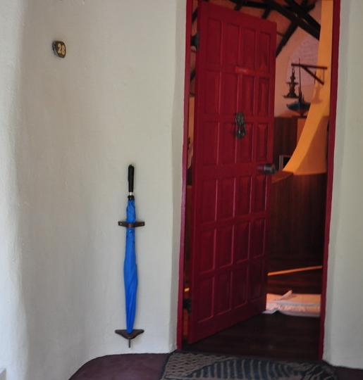 拿着房前岛上给准备的超级无敌大伞去吃早餐。