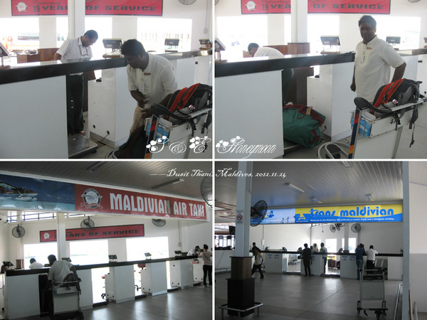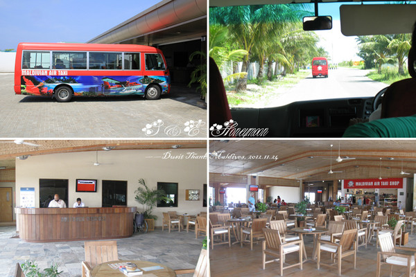托运行李后托运行李的小黑把我们交给开车的小黑,大家注意哦,bus也是红色的哦,跟水飞一个颜色,而且印的字都是“MALDIVIAN AIR TAXI”呢。bus就会带我们去休息室啦,中间不会等人,上车就走,车上空调开得很足~~