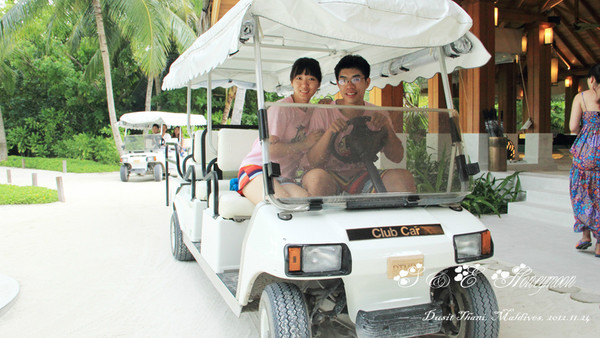 buggin是随时可以叫的并且免费,我们吃蜜月餐的时候就叫过一次,但都喜有个好处是有免费自行车,但是车子有限,不是每个房间都有的,所以一定要让你的管家帮你留意,有空闲的自行车就要及时的告诉你。