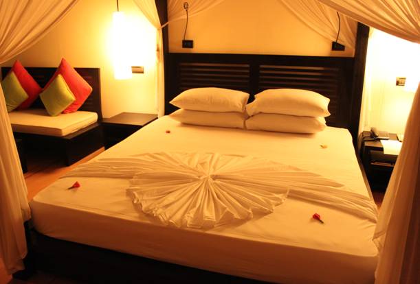 每天傍晚 房间都有服务生,做夜床服务,把床单摆成各种形状,还在桌子上摆上各种水果和小点心