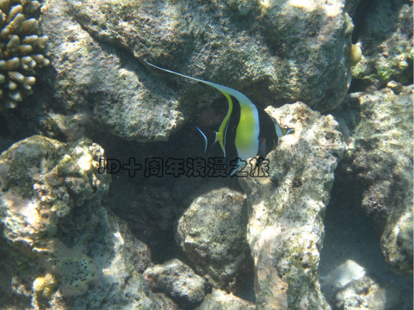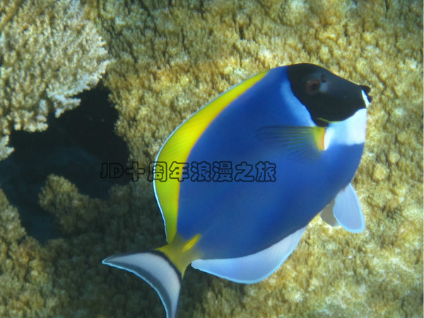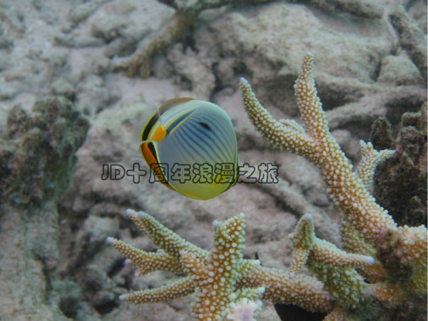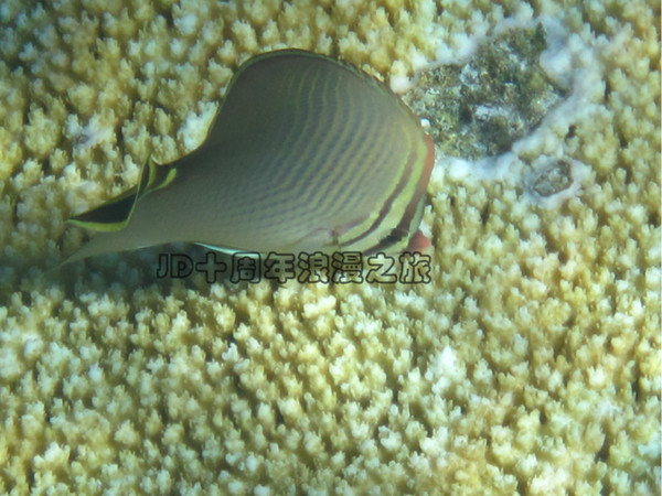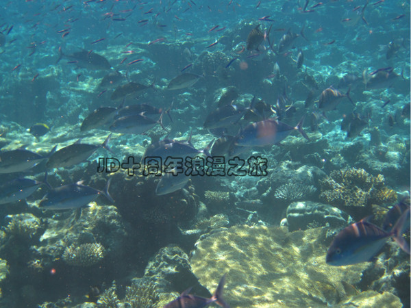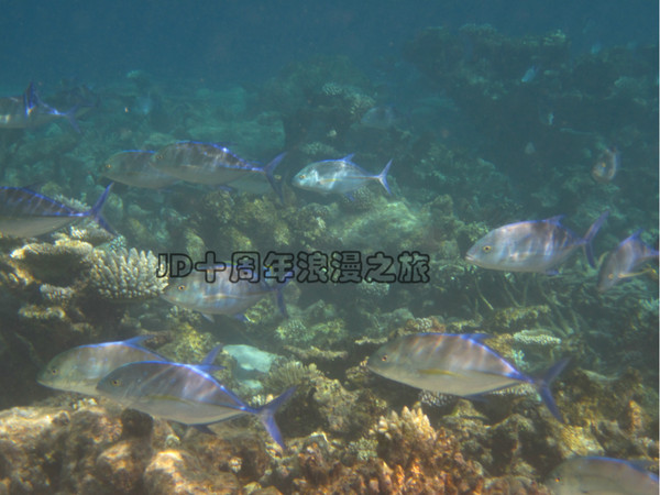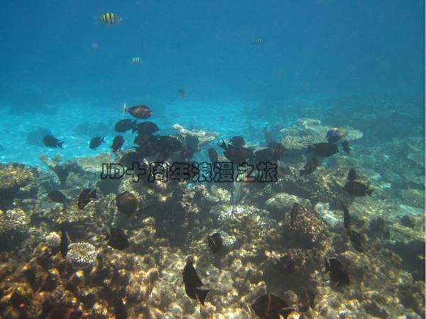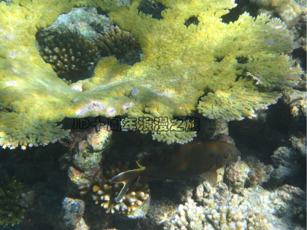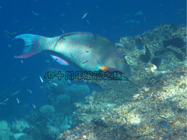 ),但手和脚背依然在浮潜的过程中受伤了(珊瑚刮的,能有三四处小伤口吧)。虽说不严重,海水还能消毒,但以防万一,还是建议大家带好创口贴,不下水的时候赶紧包扎一下。 好了,醒提完了之后,该说正事儿了。这次的JD浮潜之旅,俺觉得还是灰常不错滴~~虽说有点小遗憾——没有见到传说中的大海龟(有好多攻略里说浮潜时见到了玳瑁,这也成了我出发前的一个梦想),但JD的几天浮潜还是给了俺和老婆很多意外惊喜。