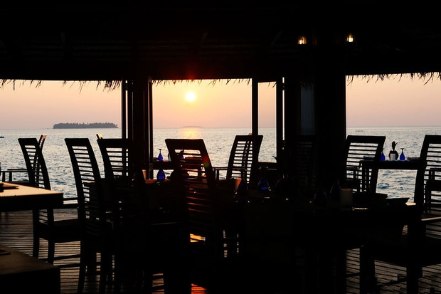 19、从微拉瓦鲁悦椿度假村的海上西餐厅望去,夕阳映红了浩瀚的海洋,也映红了温馨的西餐厅。凭着和煦的海风,望着夕阳慢慢地沉入海底,听着美妙的音乐,来享受一顿无比浪漫的晚餐。
