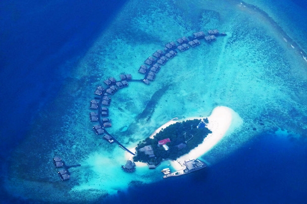 3、这里确实是不折不扣的度假天堂。除了岸上的沙滩别墅外,50间水上屋按弧形一字排开。在休闲平台上,各别墅之间毫无干扰,既可以直接面对大海与沙滩,又有极好的隐私,难得见到这样极具人性化的设计。