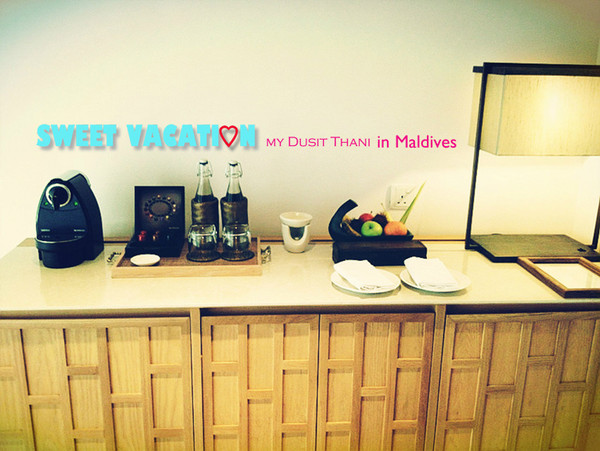 房间进门的玄关,咖啡机,饮用水,迎宾水果一应俱全