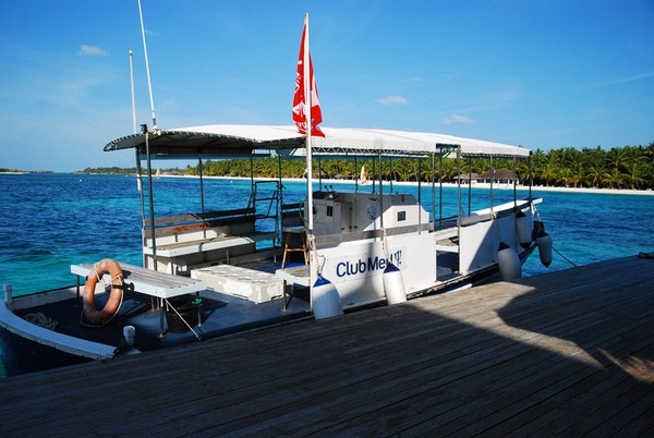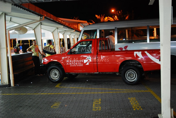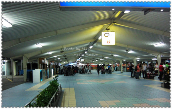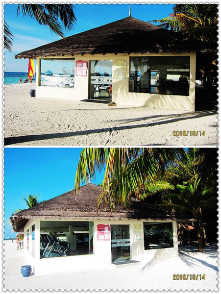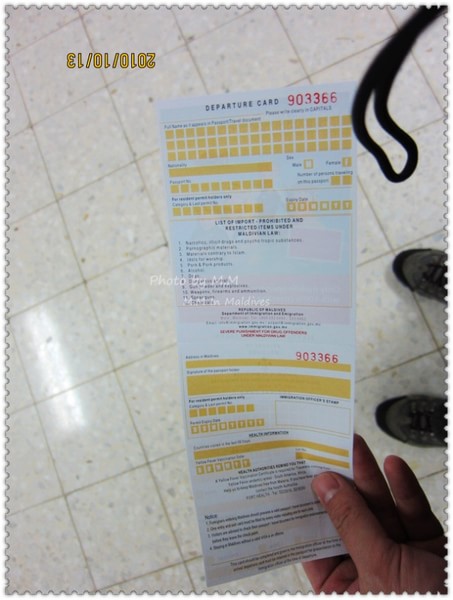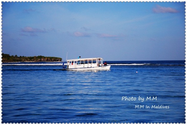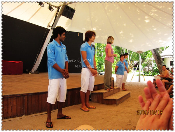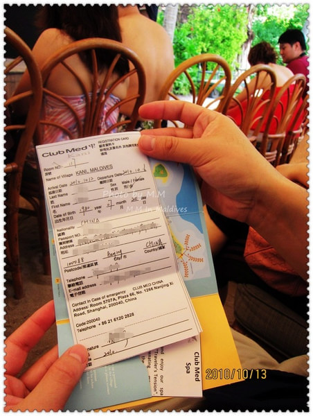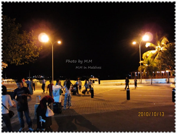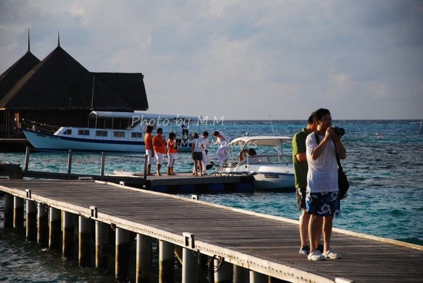 下午,参加了沙滩婚礼后,吃完饭,大概8点半左右我们就去了码头准备前往机场了。到了码头,有G.O会问你的房间号做登记,然后小黑会让你自己找自己的行李,然后他们把行李装在快艇上,等到了9点,离岛的客人齐后,上快艇前往机场;这时,Kani岛的村长及G.O都会出来送行,他们会不停的向离岛的快艇挥手道别,直到我们彼此看不到后,他们才会离开回到工作岗位上。