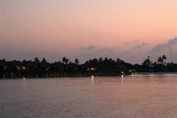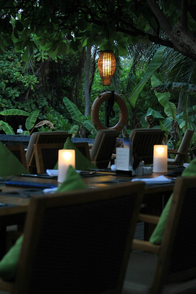 回来的时候正好是碰到海豚,快艇的海员们很热情的指着海豚看,配合着有频率的口哨声,还追了一会儿海豚,好不热闹。 今天的晚餐是ISLANDERS GRILL RESTAURANT,这是上岛的第一次正餐,这个时候差不多是8点了,餐厅的桌子全部放在沙滩上,漫天的星斗,海风微微的,微微的灯光,很是浪漫。