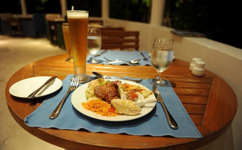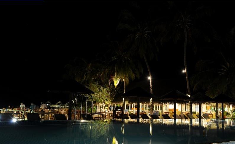 给自助餐厅来一个夜景,可以选择坐在里面吃或者在外面吃烛光晚餐……烛光晚餐的光实在太暗了……而且有蚊子……- - 所以我们吃了一次外面之后就全都坐在里面搞定了