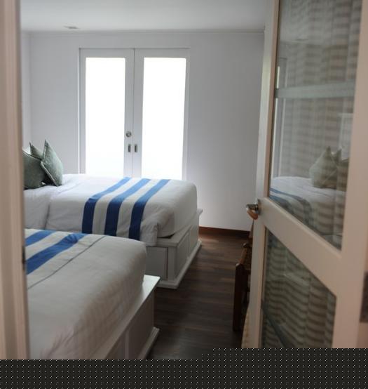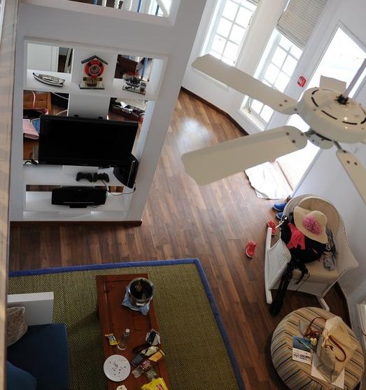 **沙屋分为两层,楼下有沙发,书桌,卫生间,卧室(两个单人床- -),楼上是大床和一个小卫生间。
