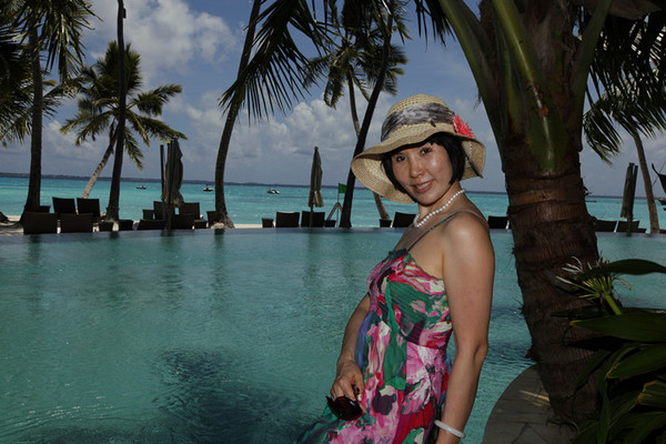 还有一次,我和老公骑车出去,突然他的车筐上掉下个什么物件,他停车正想看个究竟。刚好碰上两个背着农药的小黑从我们身边走过。(香岛每天定时撒药驱蚊虫,所以在岛期间我一只蚊子没见到)。见老公遇到点麻烦,他们主动停下来,帮老公把掉了的零件装好。这本不是他们的份内事儿。可见,岛上的小黑服务意识非常强。他们不是各扫门前雪,而是尽己所能,全方位地为游客提供帮助和服务。老公的墨镜失而复得也说明了这一点。是这样:离岛的前一天上午,我和老公出去摄影,结果他把墨镜遗忘在了路边。回到房间天下起了大雨,我们就没回去找。第二天早餐时,我们顺便给来找我们话别的餐厅经理胡小姐(中国人)说了。其实我们是随便说一说的,没指望找回,毕竟都事隔一天了。但她认真问了我们丢的地方、有什么特征等等,半个多小时以后,她满头大汗脸红扑扑的回来了,原来,我们在凉爽的餐厅享受美食的时候,她却大热天走了很远的路(因为岛大啊),到类似于“失物招领处”亲自找来了老公的墨镜。我们好感动!听她讲,岛上捡到的东西,都会交到“失物招领处”,会记录时间地点等信息。如果游客回国仍然需要这些丢失的物件,香岛依然给邮寄。不过邮费要顾客承担。