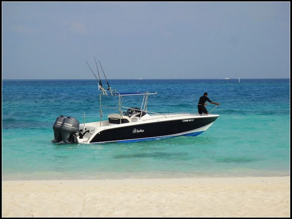 出海海钓的快艇回来了,钓了条很鲜艳的红色大鱼。