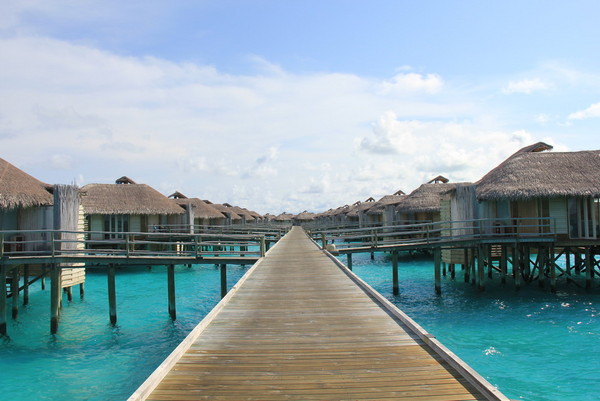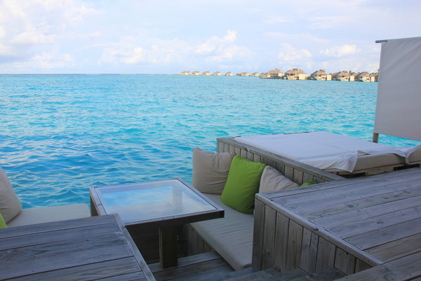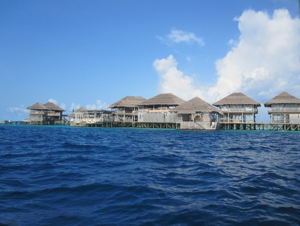 等我们全部安顿好,夕阳西下了,从在广州前一天的晚上8、9点钟出发去机场,到当天到岛上的水屋我们整整用了近22个小时,一天都在飞机上,要不就是在等飞机,但是一看到麻袋美丽的景色,一切的劳累全部忘却了,只想投入这天堂一般的大海蓝天中啊