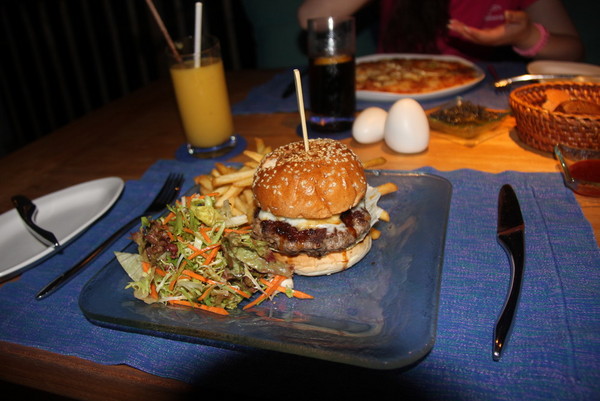 晚上我们去的酒店的Chill bar吃的饭,这顿饭是我们吃的最便宜的,一杯可乐5刀,一杯混合果汁10刀,一个披萨25刀,一个牛肉汉堡25刀,还外加服务费