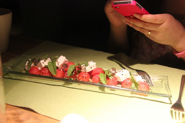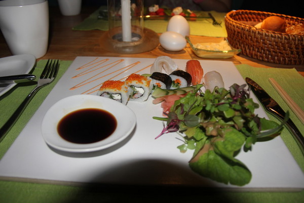 我们订的是只包早餐的价格,当天到岛后我们去主餐厅吃了第一顿饭,75刀一个人,我们喝了一瓶水,加上服务费,我们这顿饭吃了180刀,一个人各三道菜,前菜、主菜和甜品。 前菜(我的寿司和刺身