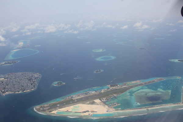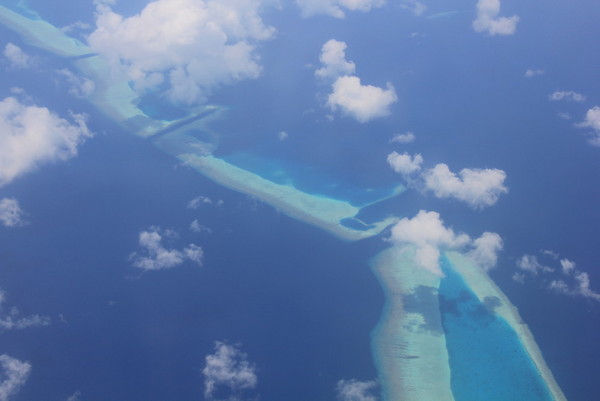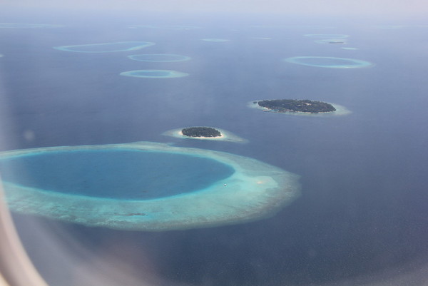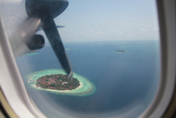 从马累飞去Kadhdhoo机场要45分钟,在飞机上就一杯果汁打发我们,好就好在可以看下面无数的海岛。首先是机场岛和麻袋首都马累