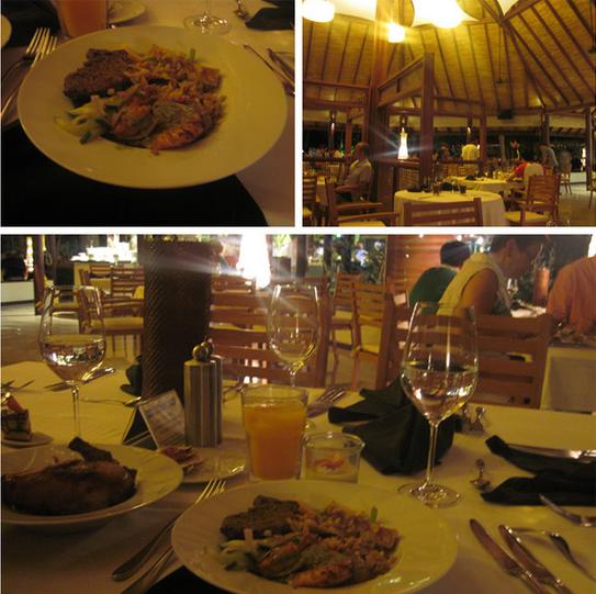 但如果是刚下过雨,餐厅就会有许多苍蝇。。。。厄。。。大家要做好心理准备,还是挺煞风景的,不行就坐在户外,海风大一些也许能挡住一些。。。中文接待serena说是因为下雨有一些螃蟹会冲到餐厅前的礁石上挂掉。。。不知为啥R岛不使用咱们这餐厅必备的那种红外线灭蝇装置呢?