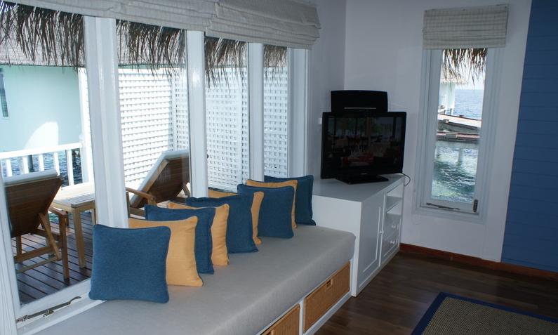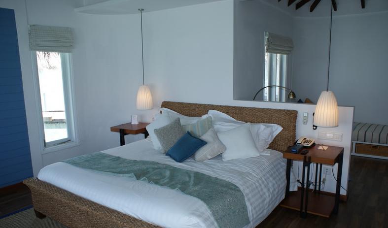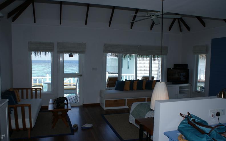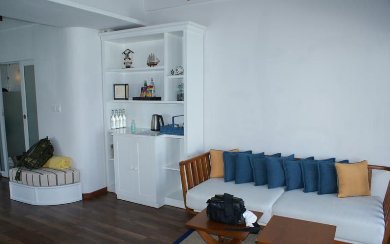 屋里是白蓝黄色调的物件和摆设,浮潜条件据说尚可,