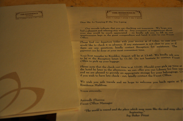 再次回到房间,离岛信已经送来,我们从马累飞科伦坡的飞机是晚上8点半,