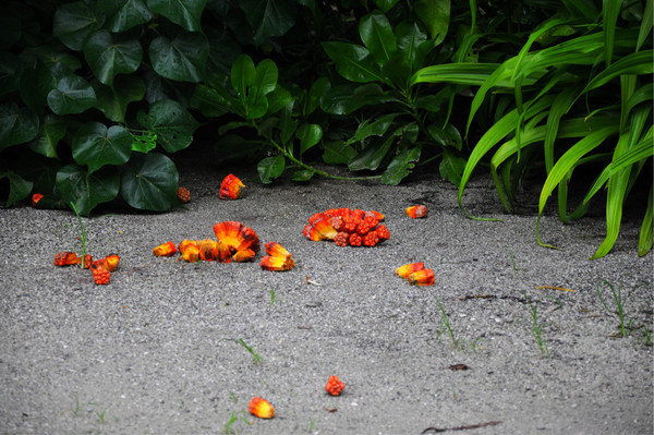 我们循声望过去,正好看见男的把这个红色果实揪了下来,费了不少劲。