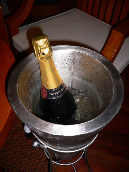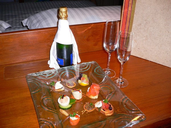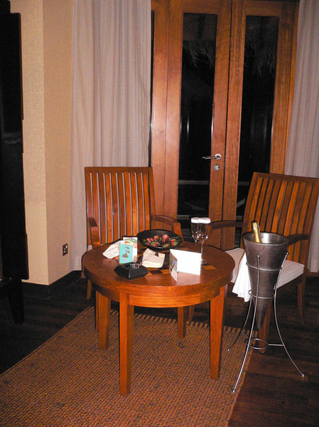 七转八转后终于来到了我们的房间~ 推开门一看,挖!欢迎卡片,冰镇大香槟,还有新鲜的草莓裹巧克力。。。