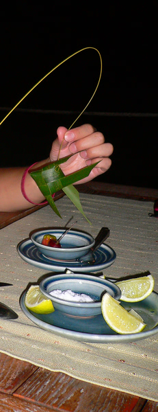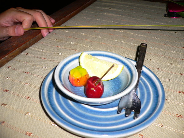 对了,还有冰淇淋盘子左边的那一根,原来是泰餐里必不可少的酸甜酱的来源,她特地拿来给我们尝尝,让我们自己回家如果找到这种植物的话就可以自己做了。。(太高估我们了。。囧)我总结了一下,应该和云南的酸角差不多味道~