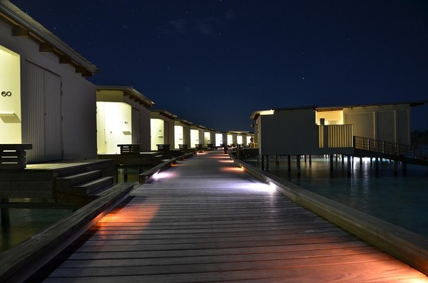 晚上的水上屋走道,还是挺漂亮的,沿着这道走到头有个小亭子,晚上都会有个保安在这边。
