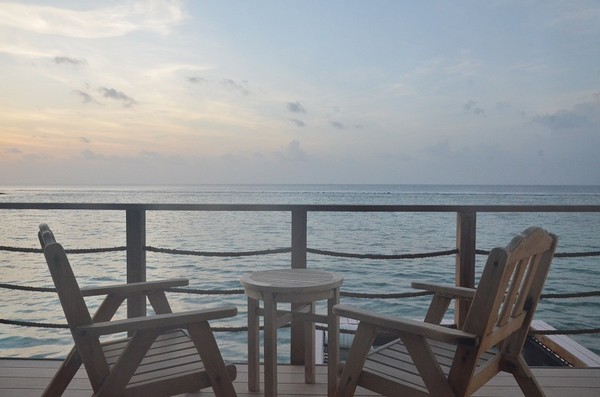 阳台的门一拉开有有一对椅子,我们的水上屋面对海,所以一觉醒来,就可以从房间看到日出,无比惬意。