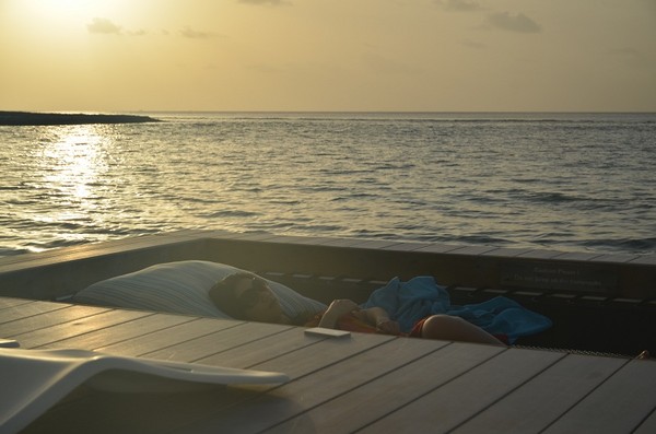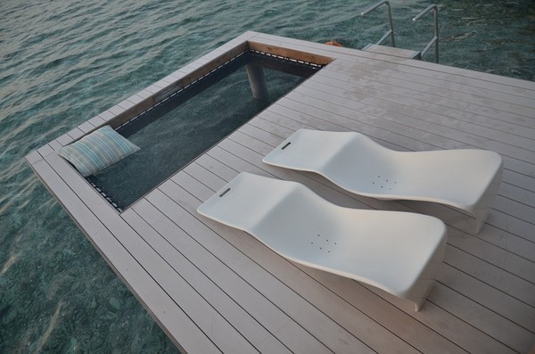 每间水上屋的露天浴缸前面都有一个走道走下去,有2张躺椅,早上跟傍晚躺在这里很舒服,当然中午躺这里会被晒成人干,前面还有一个网床,挺舒服的。