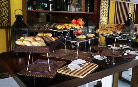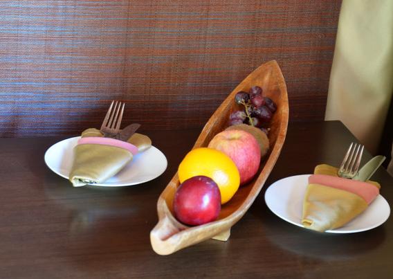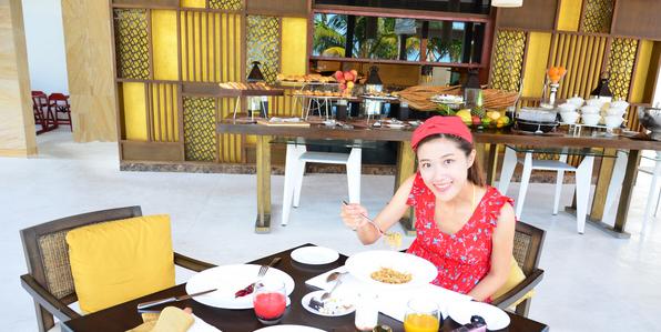 在露天吃早餐,面朝大海。jd桌上的餐巾都是真丝的