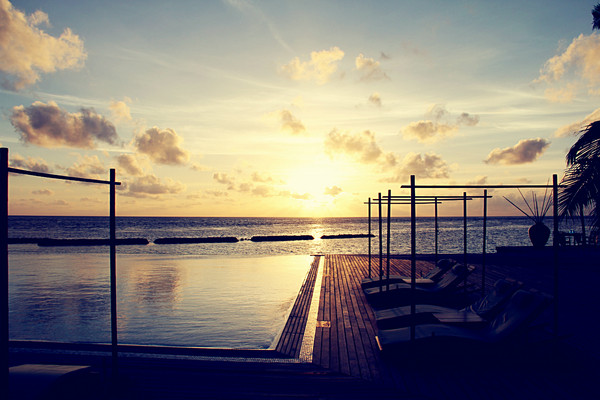 我们选了日出沙屋,日落水屋,在沙滩上看日出,躺在水屋里喝着香槟欣赏日落,那片宁静的海,和天在一起,即使昼夜更替,日出日落也没有分开过,就像我们的名字,一个是天,一个是海,海天相连......