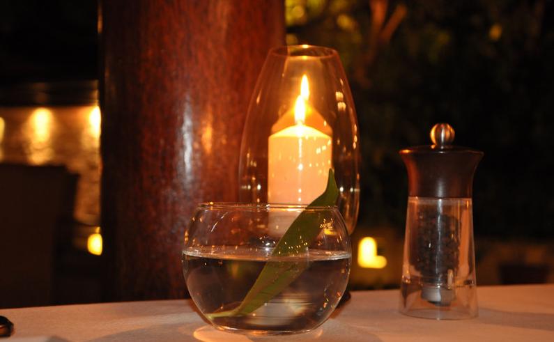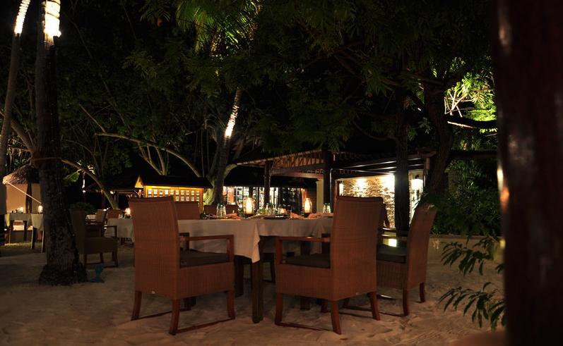 晚餐的布置以及灯光设计极其浪漫,每盏灯都挂在一个椰子树干上。暗暗的黄色灯光突显幽静,完全抢不了沙滩和星空的风头。