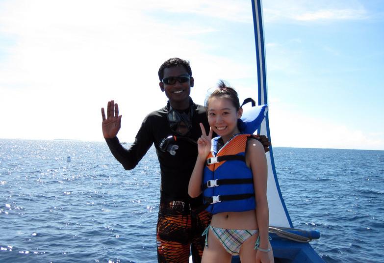 **潜水时应该注意几点。首先无论深潜还是浮潜,提前在水上中心询问好涨退潮时间。因为如果是退潮浮潜又不穿脚蹼的话非常危险。论坛上曾有人说过自己的亲身经历,差点游不回来。因为退潮时潮水似乎有种吸力会把你死死的往深海拖,所以切记要穿脚蹼和救生衣。救生衣是最后一道生命防线!如果你不是那么确定自己的游泳技术,希望每一个下去的同学都穿救生衣。虽然穿上救生衣后你的游泳速度会受到限制,但如果因为水温导致抽筋,再好的游泳技巧也避免不了呛水。脚蹼也是非常有必要的,拥有脚蹼的游泳速度是平时的4-5倍,如果真的不幸被潮水吹向深海,脚蹼比救生衣更能让你脱险,这次在悦榕庄我们能天天浮潜好几次就多亏了有脚蹼。