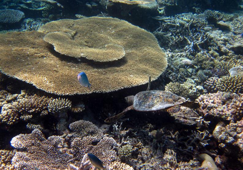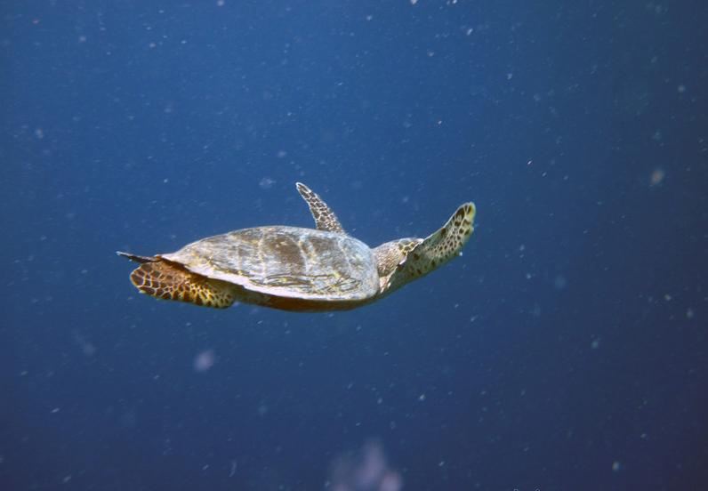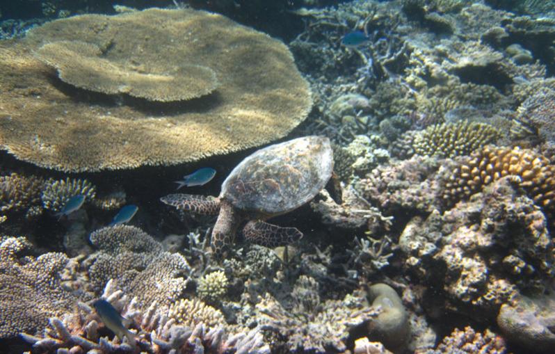 海龟保护基地位于浮潜中心正对着的离海沟很近的浅滩上,是一个蓝色的铁架子。当时我们去的时候有两只大海鱼和一只小海龟。悦榕庄很注重海底生物以及自然环境的保护,每次有小海龟出生,只要他们发现,都会抱回来养大之后放生,而且每天下午5:30都会有喂海龟表演,告诉游客海龟的生活习性之类的。不过看这个表演跟电鳐可不一样,需要游客自己浮潜游过去。**