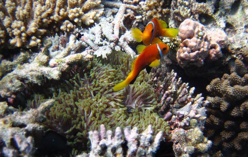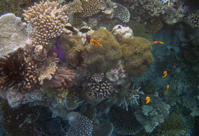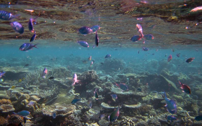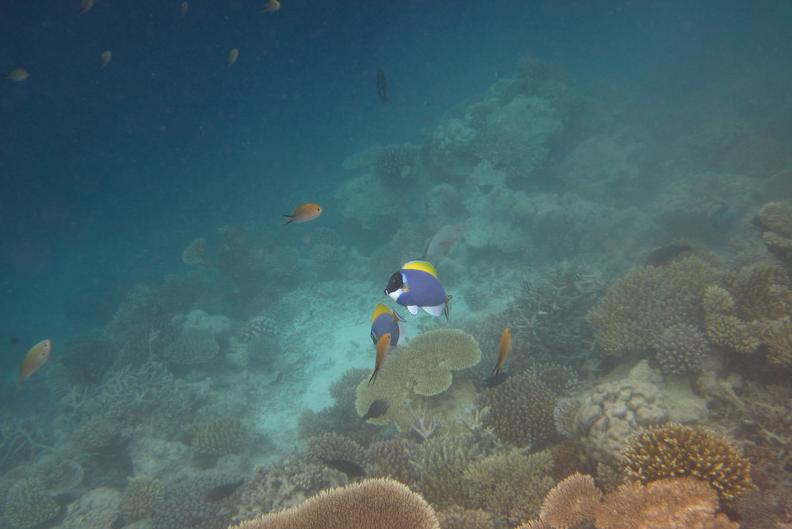10:30我们在码头等待多尼船接我们出海。一共应该2对夫妇,另一对不知道什么原因没有来,等了他们5分钟。最后就只有我俩参加了这个项目,真爽!相当于包船包小黑了。带我们出海浮潜的小黑正好是我的浮潜教练,人很好,下水之后我直接把相机交给了他,让他帮我们拍照。出海浮潜就是坐船把人拉到一个深海中的浅滩附近,围绕着这个浅滩的海沟浮潜。出海的好处是由于离岛远,珊瑚保存得更完好,幸运的话能碰到自由的海龟。