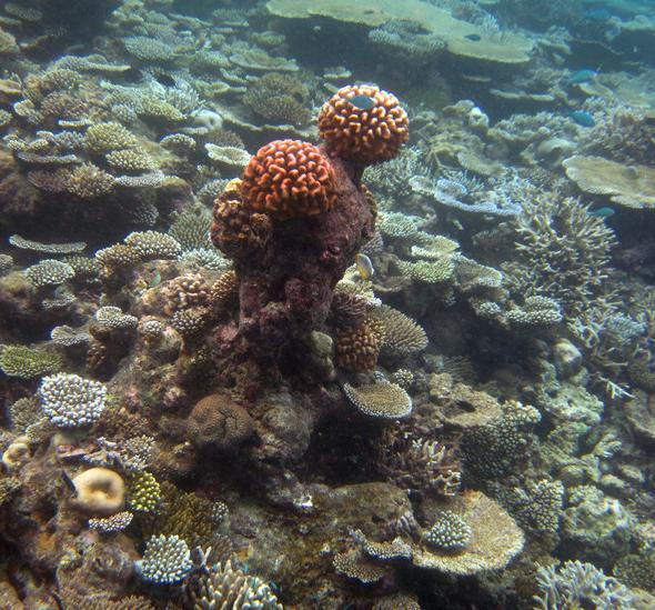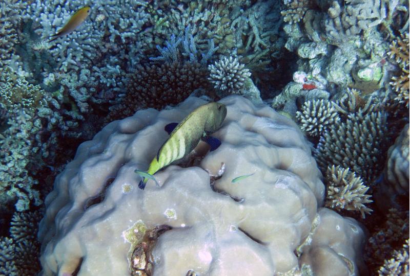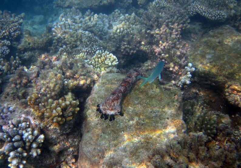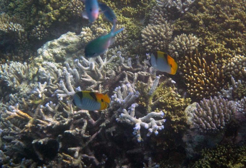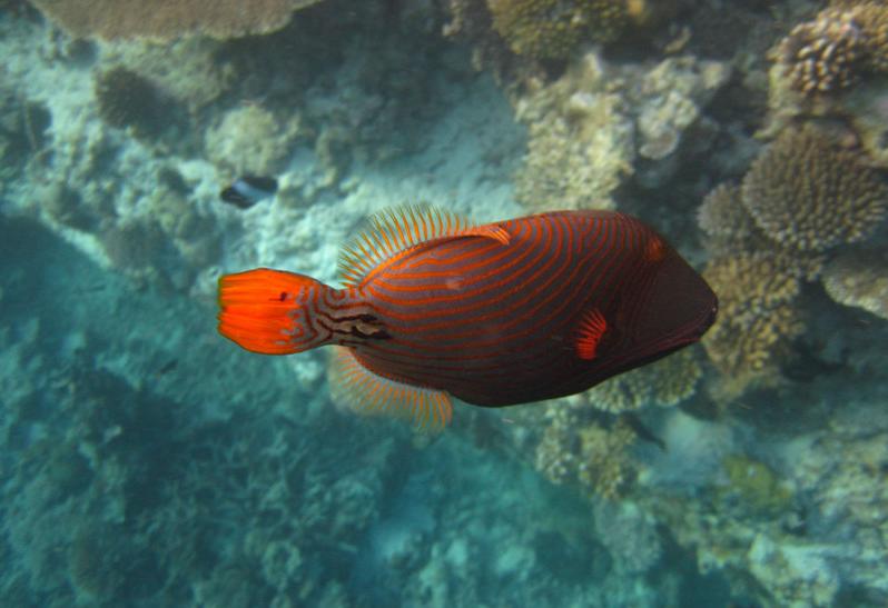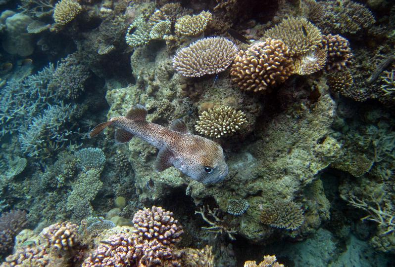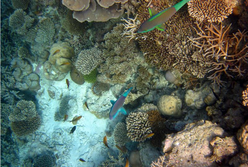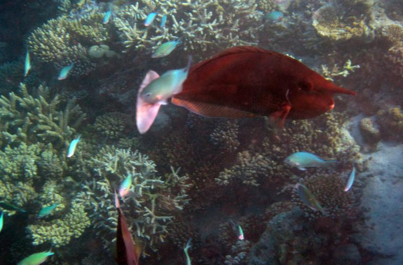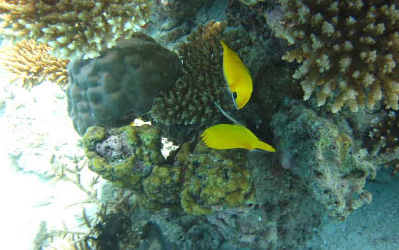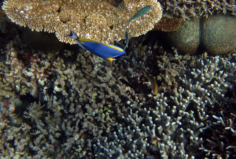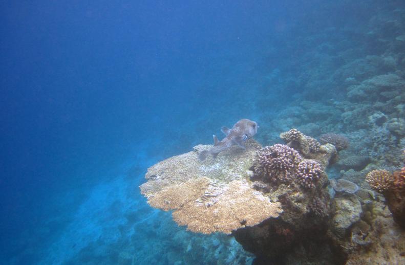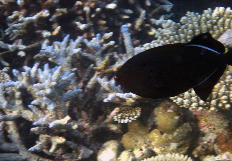 8:00这个时候太阳已经出来了,光线也不错了,在别墅穿好装备,我俩就带着防水相机去潜水。这次我俩打算绕着昨天小黑带着我游的一小圈游一遍。其实浮潜是很费时间的。两个出入口真的相距没有多远。我们从下水绕一圈再上来一共用个1个多小时。不过这次看到了许多许多昨天没有看到的鱼,而且早上浮潜果然能看到白天看不到的鱼群,如果你不游只在水里飘着,它们就会游过来,把你簇拥在中间,有的还叼你的手,很有意思。