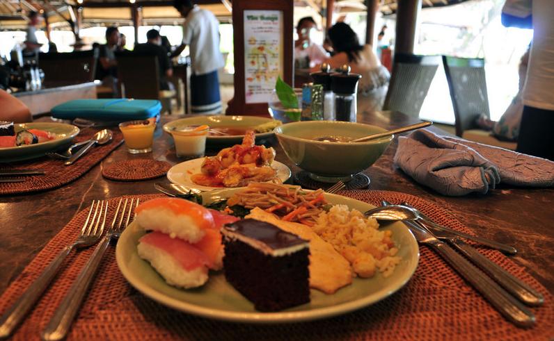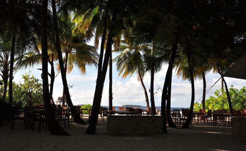 午餐是在餐厅对面的花园中吃的,花园坐落在沙滩边一群椰子树底下,我俩很喜欢最外面一排的餐桌吃饭,因为往外看就没有餐桌了,直接是沙滩,多美呀!不用担心会晒,因为椰子树又高又大,阴凉足够用!
