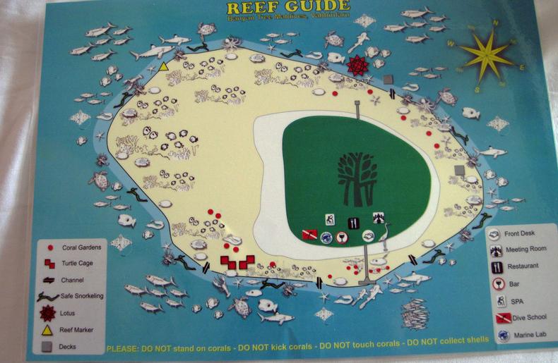 吃过早饭,回别墅换泳衣的时候接到前台电话,被通知退房时间可以推后到下午2:00,3:30之前结账就可以。我们很高兴,决定绕岛浮潜一圈。每个别墅里都有一张全岛的浮潜地图,会很详细的标记出哪里危险哪里安全,海沟出入口在哪儿,什么地方会看到什么样的海洋生物。很幸运,我们几乎都看到了。