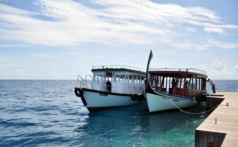 **每天从早上8:30开始,在码头有免费的多尼船可以往返悦榕庄和依瑚鲁2个岛,大概4分钟路程,每两小时一班。一定要去那里观光和浮潜,能看到不同的景色。那边海沟离岸边不足30米,海底的景色也跟悦榕庄不大一样。早上8:30那班也有可能是快艇,1分钟就能到。