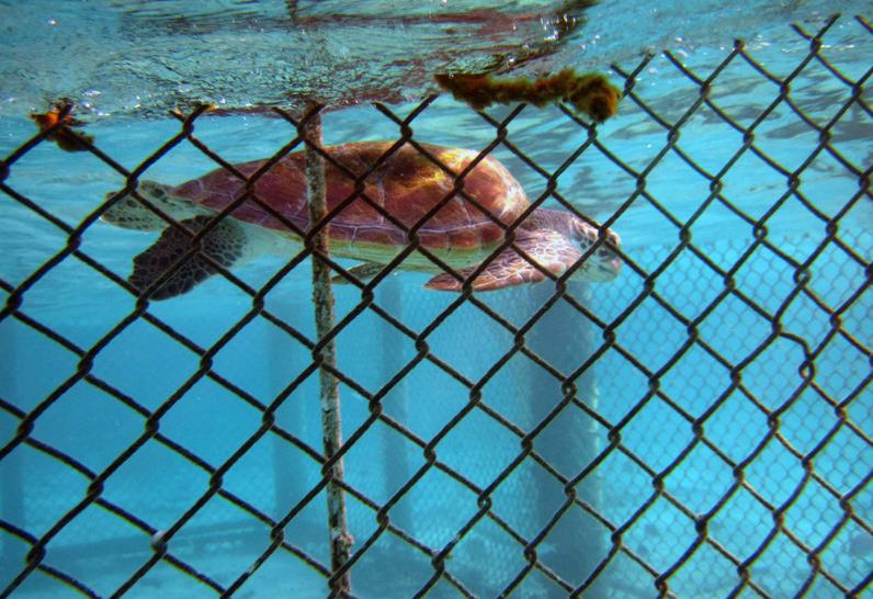 这是我第一次近距离的靠近海龟,海龟游得很慢,有时候下潜有时候回到水面上换口气。虽然是在一个大笼子里,不过看他们还是很自由自在的。大海龟比较怕人,我游到笼子边上,海龟就慢慢的背向我游走,不过小海龟很可爱,喜欢跟着人,我一靠近笼子,他就过来了,可爱的大眼睛看着我,好像在要吃的,呵呵~很萌~~而且一看他就是还很小,游泳的时候还跌跌撞撞的,还没掌握好平衡,过一会儿看你不给他吃的,他就又游回到妈妈身边去了。