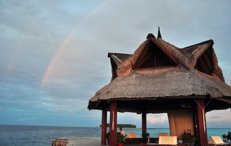 **到达悦榕庄,我们赶紧回别墅洗了个热水澡,幸亏没感冒。说来奇怪,在伊瑚鲁岛上看悦榕庄,周围都是黑成一片了,就我们岛头上没有那么多乌云,阳光照着显得最亮。而且在伊瑚鲁岛上雨下的那么大,回到瓦宾法鲁于就变得小很多,真是奇怪。