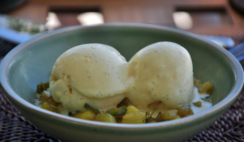 今天有冰激凌,这是我第一次看到,是不是每天都有我就不知道了。冰激凌我选的香草和薄荷两个球,底下放了炒菠萝,另一种味道,不过很好吃。