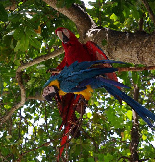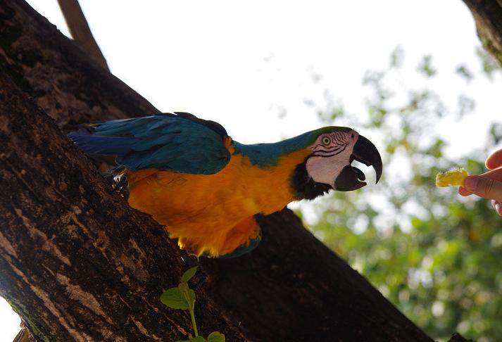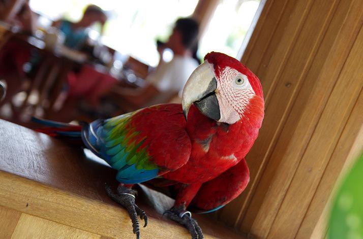 尼卡这岛虽小,但各种动物萌物确实不少。经常替Nika卖广告的有两只鹦鹉,一红一蓝,其中红的那只比较热情,或者说是顽皮吧,老是跑别人桌子旁边问人要吃的;而蓝色的那只,则是经常在餐厅外面的树上呆着,等人主动拿东西过去喂它。