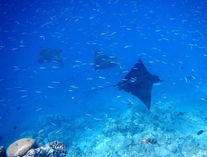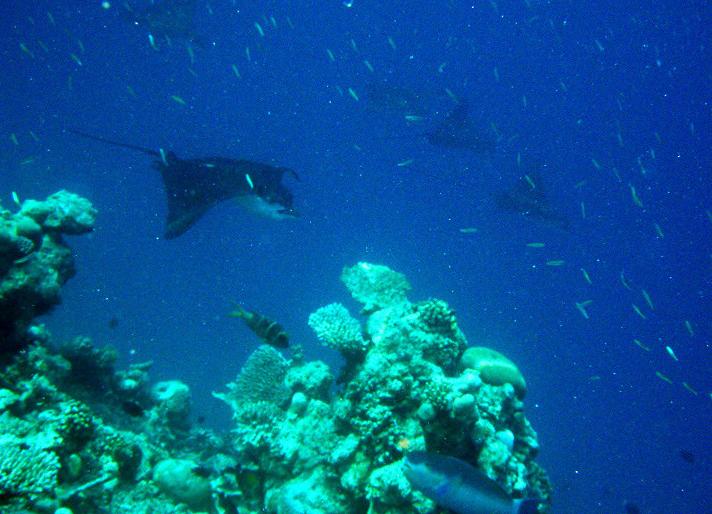 想不到魔鬼鱼群在我们身边经过时立时绕了一下,从我们身边游进了浅水珊瑚区,然后再从我们背后、身体另一边返回到海沟,完全就是围着我们几个人绕了一圈,像是特地过来给我们打了一下招呼,真着实是惊喜呀!