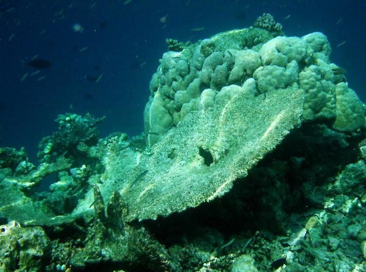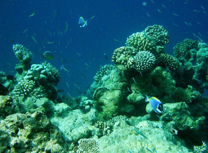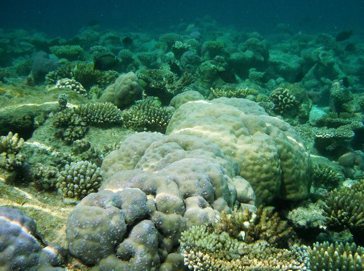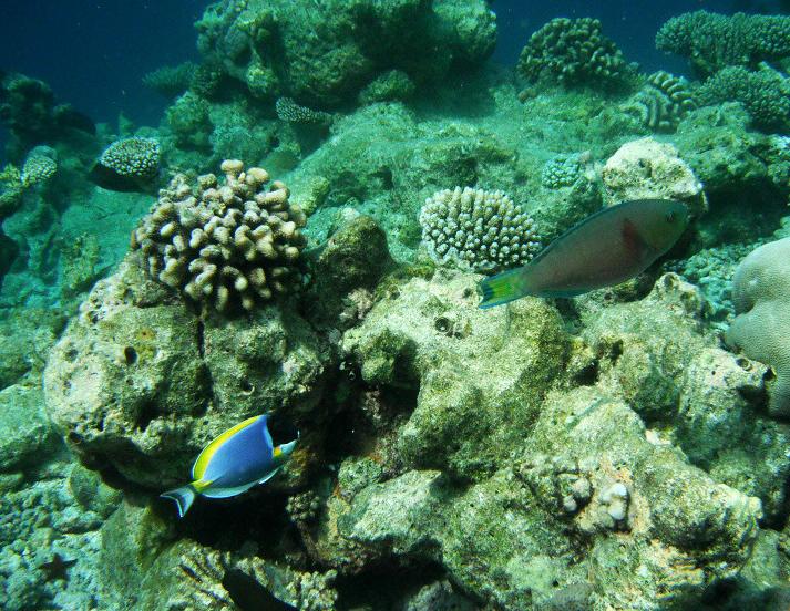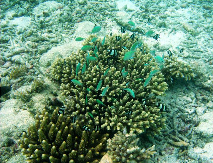 这是第一天下午大概4点左右刚刚下水时拍的相片,就是离我们沙滩5米范围以内,旁边都是白化死掉的珊瑚(珊瑚群都是从离沙滩8米以外的水域开始),独独这棵珊瑚活了下来,吸引了不少小鱼。