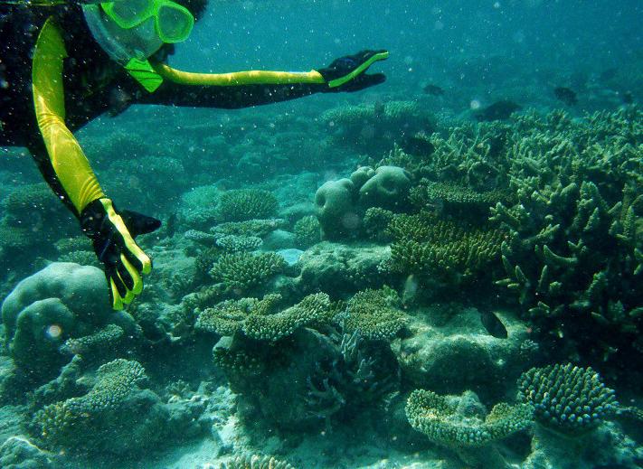 由于我没有穿连体潜水服,之前做攻略的时候又经常看到前人提示要当心珊瑚刮破身体,所以开始下水的时候非常的在意珊瑚,反倒令本来就熟悉水性的自己在珊瑚群中狼狈了一下,还踩了几次珊瑚,罪过啊
