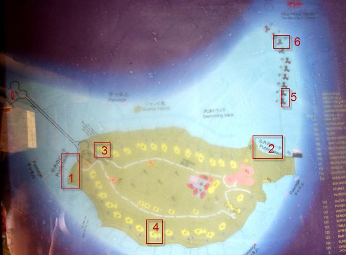 [color=rgb(0,0,0)]位置6 - 我们入住的是33号水屋。号码小的这几间水屋实在不太推荐(假如可选的话),平台位置稍向本岛方向,部分对着普沙;另外由于这几间水屋是斜着建的,所以方向上远没有40号那边开扬;而且最重要的,这边下水都是被破坏的白化珊瑚带(Nika建水屋,选择破坏了西边这一带,保留了东边那带),离海沟还非常远...