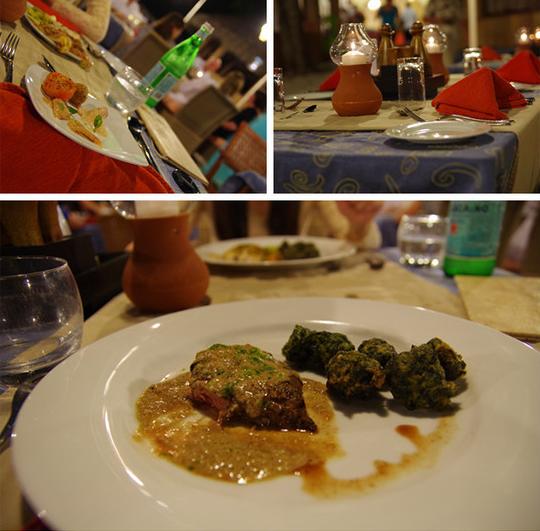 吃得比较有意思的是点餐,由于我等撇脚中国人一般看不懂那些“深奥”的菜牌(又不好意思拿手机出来查字典),所以可以到餐厅门前那去看示范的菜式;运气好的话,意大利胖子总厨会站在给你很开心地介绍每种样品和菜单的对应关系是什么。说起来那胖子总厨还是挺热情的,我问过他一次菜牌以后,后来他老过来问我吃不吃得惯,还说我喜欢的话,可以提早给他们建议,他们愿意在后一天的菜单中尝试加上中国菜。我说不用了,还是喜欢吃你的意大利菜,可心里是想,NND你个胖子做中国菜能做好?