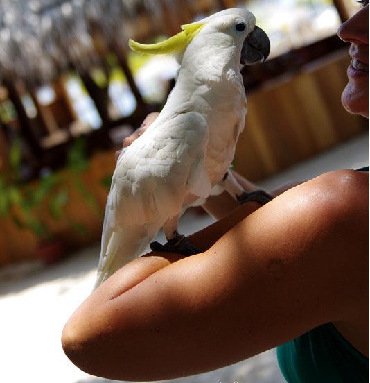 到餐厅门口,惊喜啊,第一次也是我们在岛上仅有两次看到这只白色的鹦鹉,问了一下它的名字,俄罗斯MM回答了可没记住